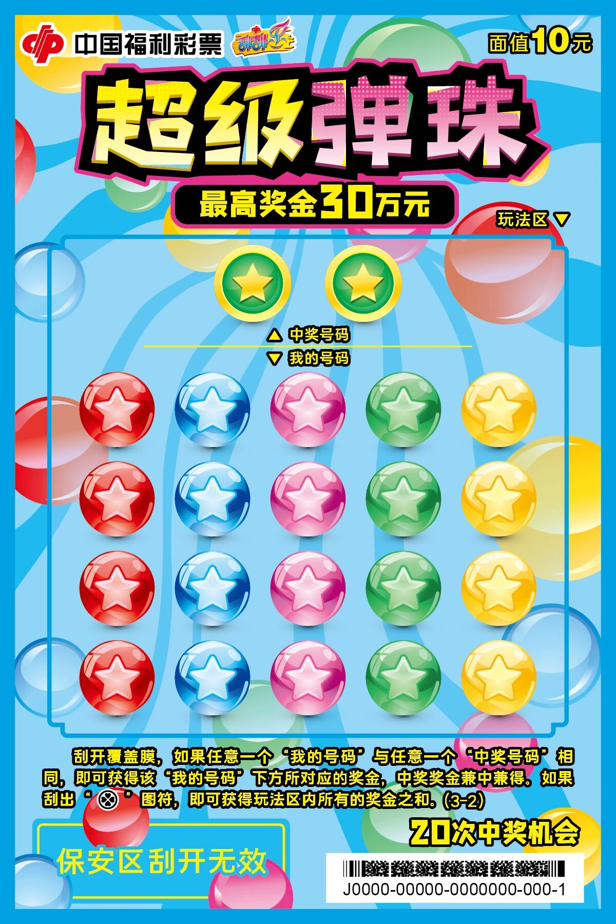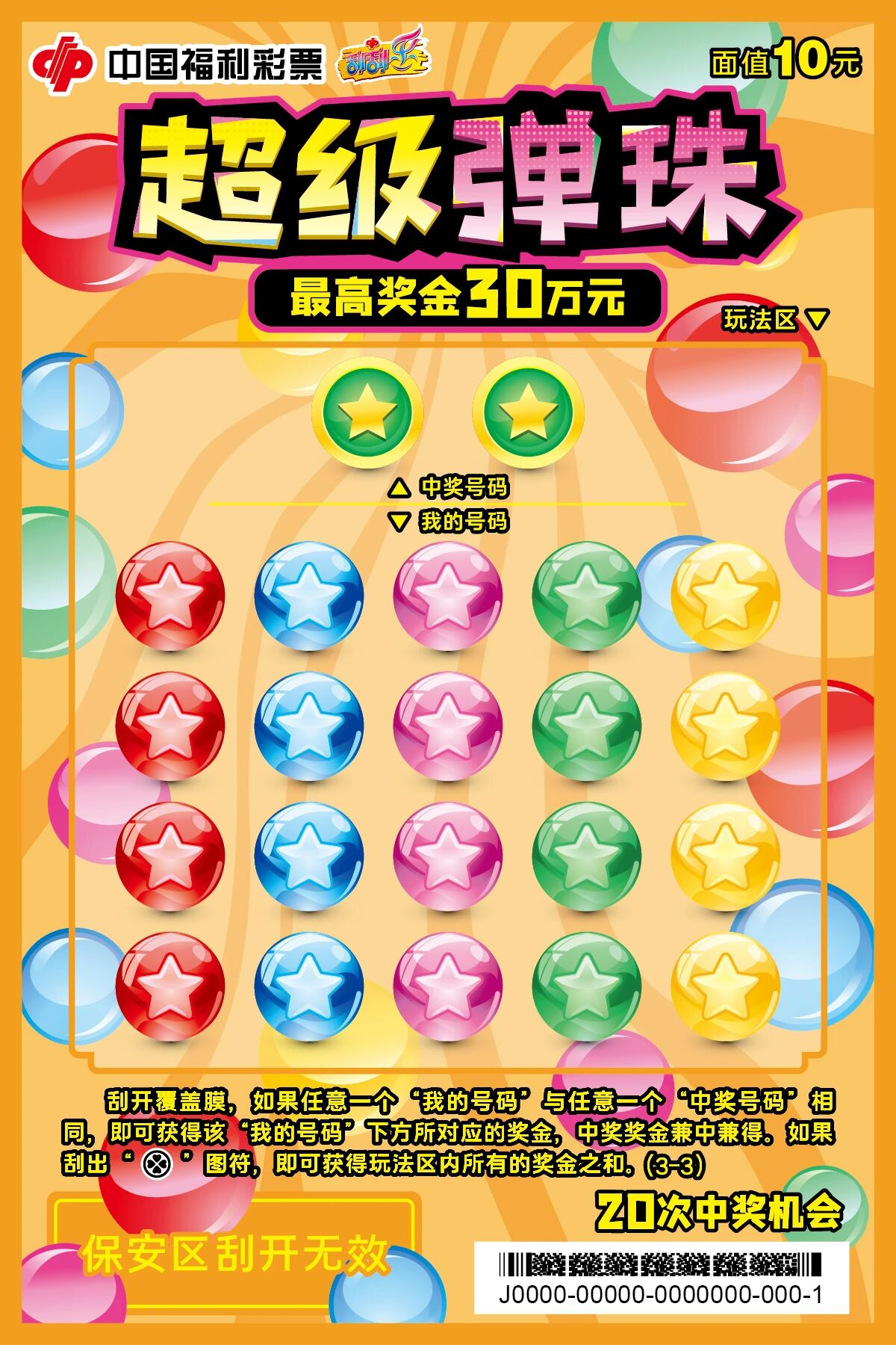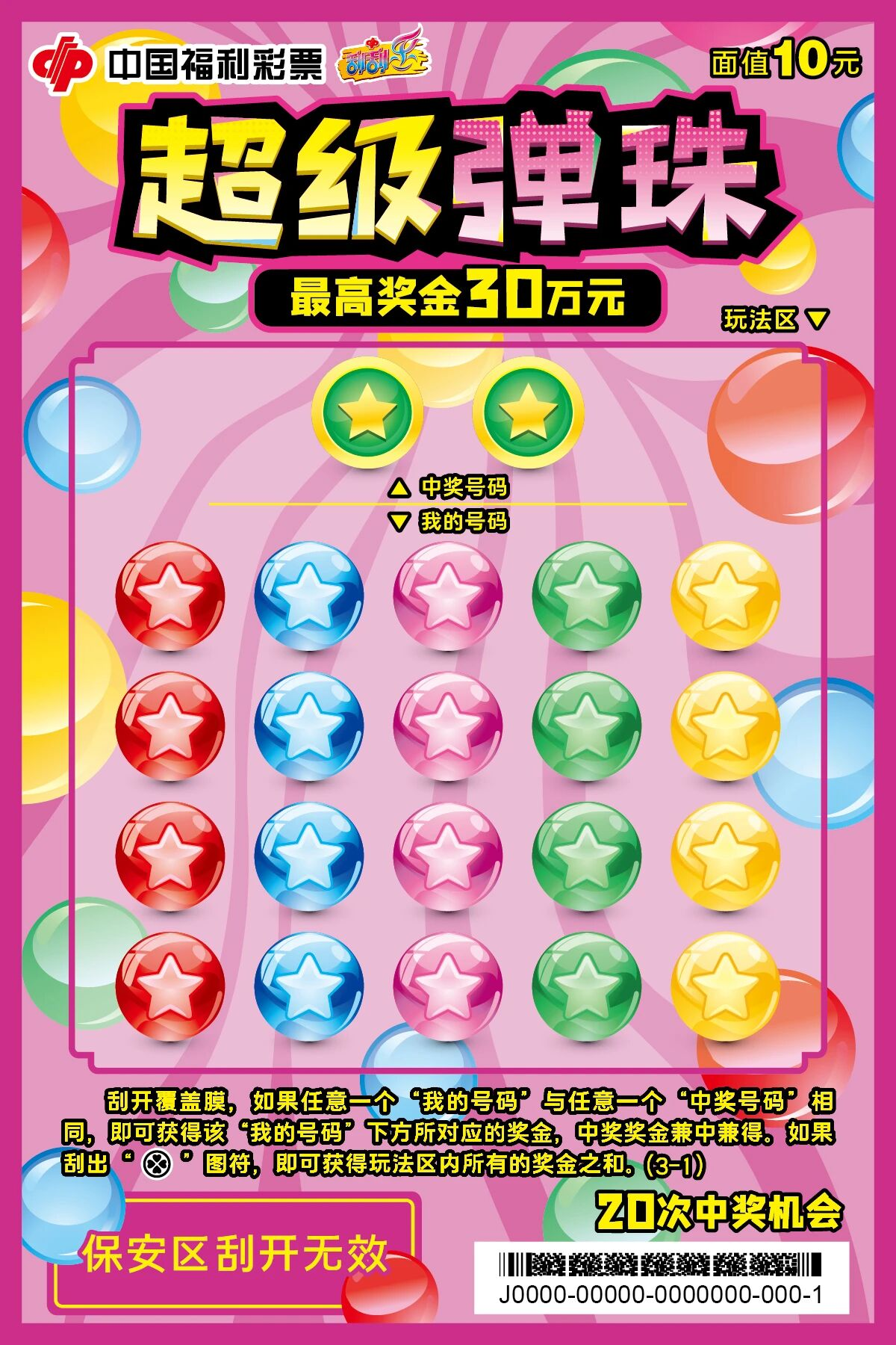 票面介绍 以大众童年经典趣味弹珠游戏为设计灵感,采用鲜活灵动的色彩搭配与卡通潮流手绘风格,复刻弹珠童趣场景,画面层次饱满、吸睛亮眼,唤醒大众怀旧情怀。 玩法详情 刮开覆盖膜,如果任意一个“我的号码”与任意一个“中奖号码”相同,即可获得该“我的号码”下方所对应的奖金,中奖奖金兼中兼得。如果刮出“金币”图符,即可获得玩法区内所有的奖金之和。